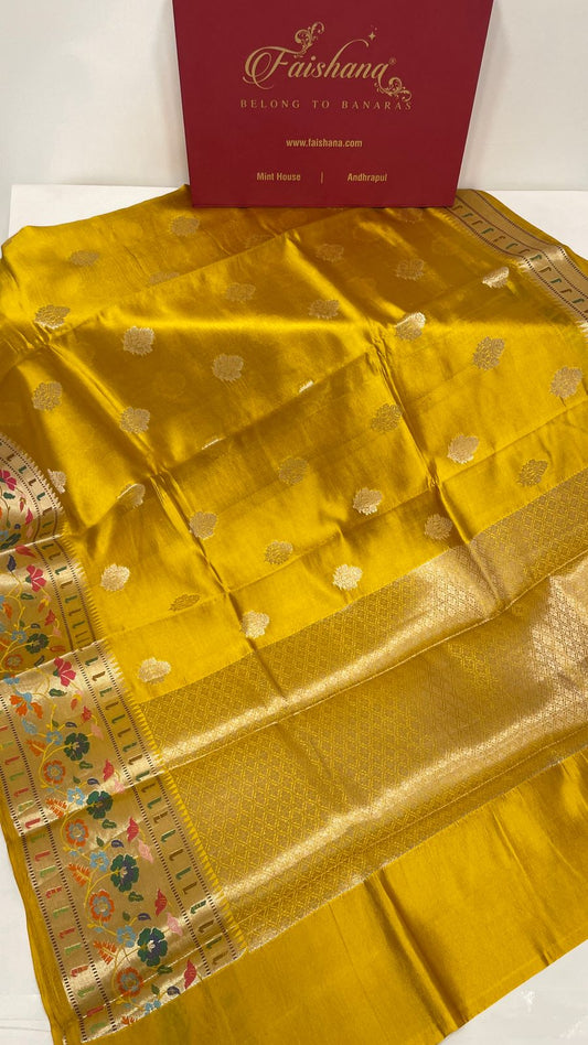 Faishana Pure Handloom Gold Dupion Silk Golden Zari Booti with Skirt Paithani Zari Border and Gold Blouse