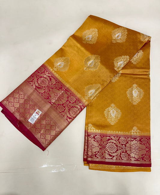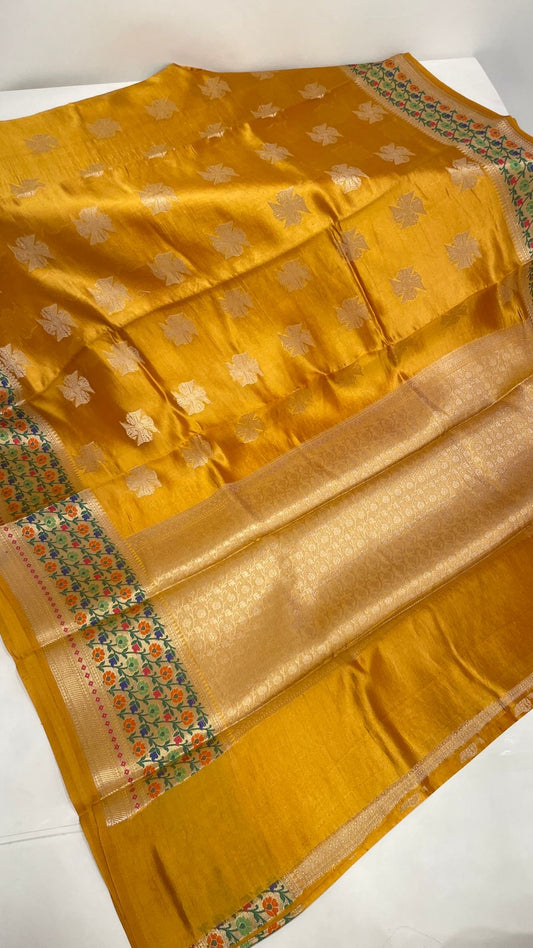 Faishana Pure Handloom Gold Chiniya Silk Floral Minakari Zari Booti with Paisley Mina Zari Border and Rangkaat Paisley Pallu with Gold Blouse