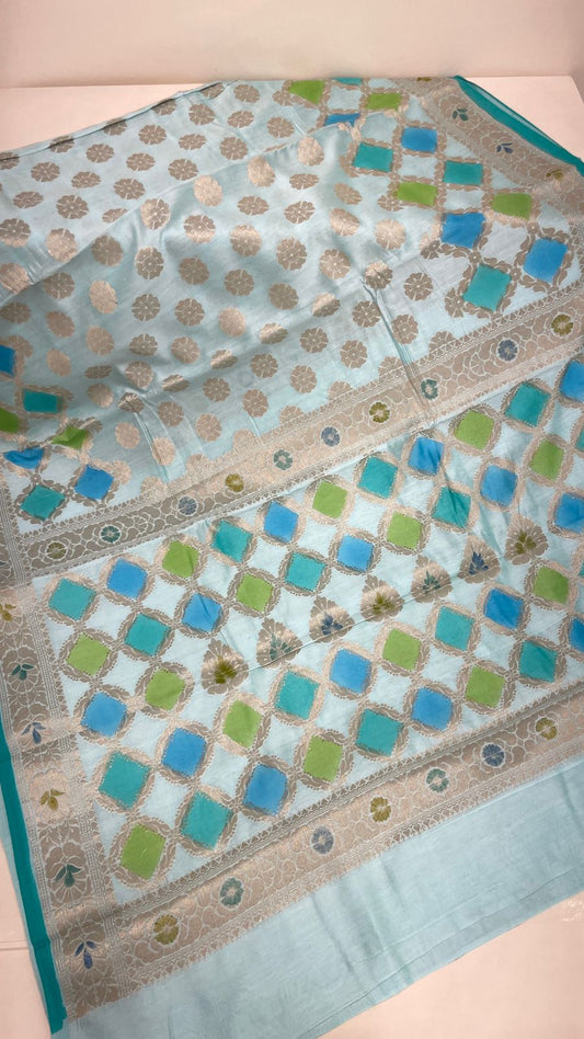 Faishana Pure Handloom Light Blue Cotton Silk Zari Booti with Rangkaat Banarasi Zari Hand Painted Floral Pallu and Zari Border with Light Blue Blouse