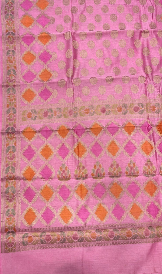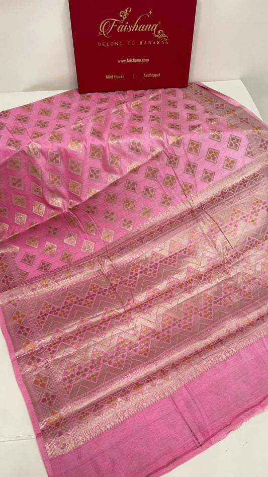 Faishana Pure Handloom Baby Pink Cotton Silk Zari Booti with Rangkaat Banarasi Zari Hand Painted Floral Pallu and Zari Border with Baby Pink Blouse