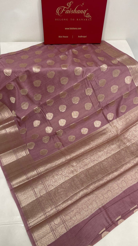 Faishana Pure Handloom Light Mauve Cotton Golden Zari Mina Booti with Skirt Banarasi Zari Border and Light Mauve Blouse