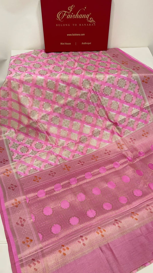 Faishana Pure Handloom Baby Pink Munga Silk Floral Gold Zari Booti with Contrast Pink Floral Jaal Pallu Skirt Dual Shade Zari Border with Pink Blouse