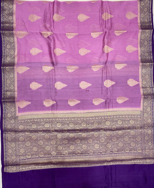 Faishana Pure Handloom Dark Pink Organza Floral Zari Booti with Contrast Purple Big Floral Boota Pallu Zari Border and Purple Blouse