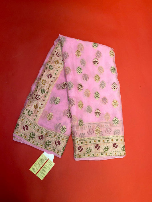 Faishana Presents Pink Chiffon Handloom Mina Zari Booti with Resham Golden Zari Kadiyal with Banarasi Mina Border with Pink Blouse