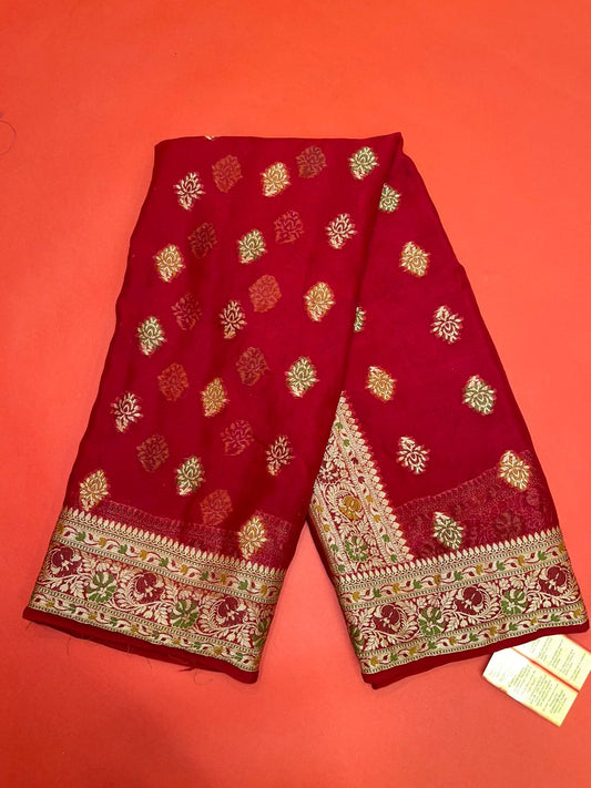 Faishana Presents Handloom Red Chiffon Resham Mina Zari Booti Kadiyal Anchal with Banarasi Mina Border and Red Blouse