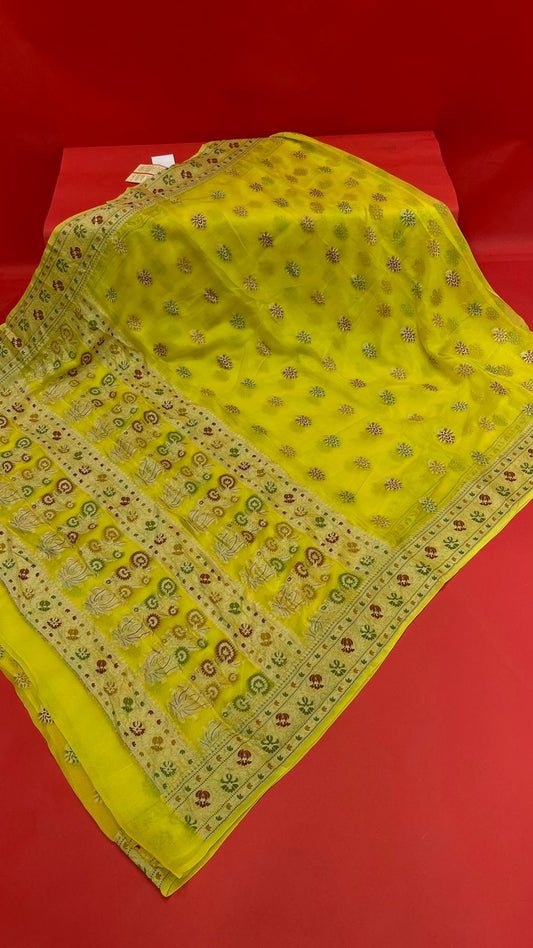 Faishana Presents a Yellow Chiffon Handloom Mina Zari Booti with Resham Golden Zari Kadiyal with Banarasi Mina Border with a Yellow Blouse