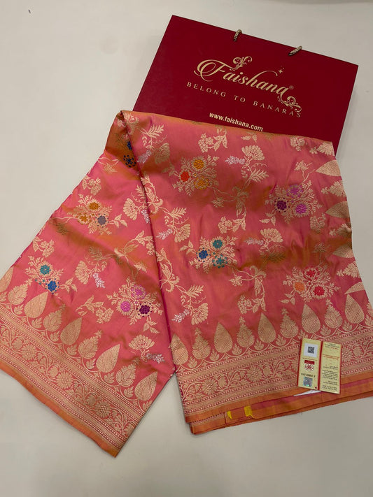 Timeless Elegance: Faishana Pure Handloom Katan Silk Pink Minakari Floral Jangla Jaal Booti with Kadhwa Stripe Blouse