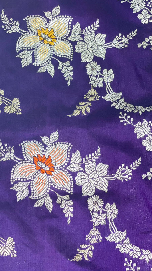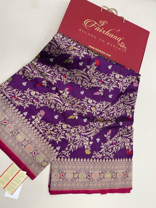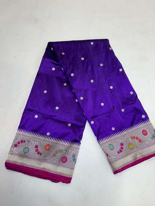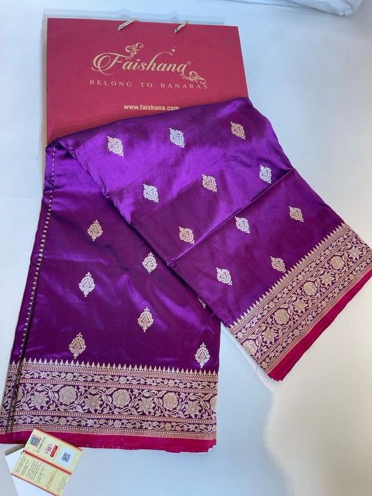 Faishana Pure Silk Handloom Purple Katan Silk Kadhwa Sona Rupa Zari Floral Booti with Kadhwa Border and Purple Stripe Kadhwa Blouse