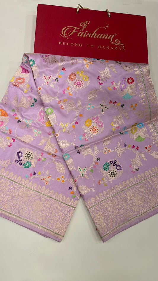 Enchanting Elegance: Faishana's Pure Handloom Katan Silk in Light Purple Meenakari Kadhwa Floral Jangla Booti Kadhwa Border and matching Purple Blouse