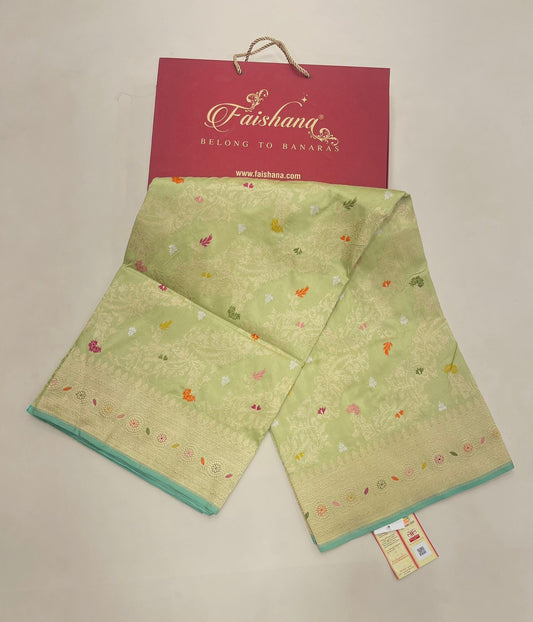 Faishana Pure Handloom Katan Silk Pista Green Jangla Meenakari with Kadhwa Border and Pista Blouse Banarasi Saree