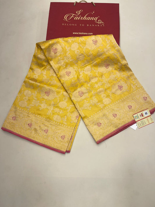 Faishana Pure Silk Handloom Katan Yellow Kadhwa Jangla Mina Jaal with Kadhwa Zari Border and Yellow Mina Blouse