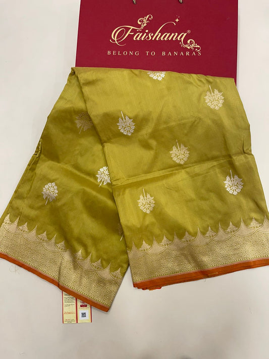 Faishana Pure Silk Handloom Katan Silk Olive Green Kadhwa Floral Booti with Kadhwa Zari Border and Olive Green Stripe Blouse