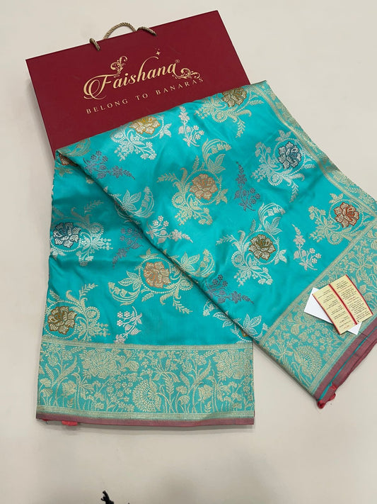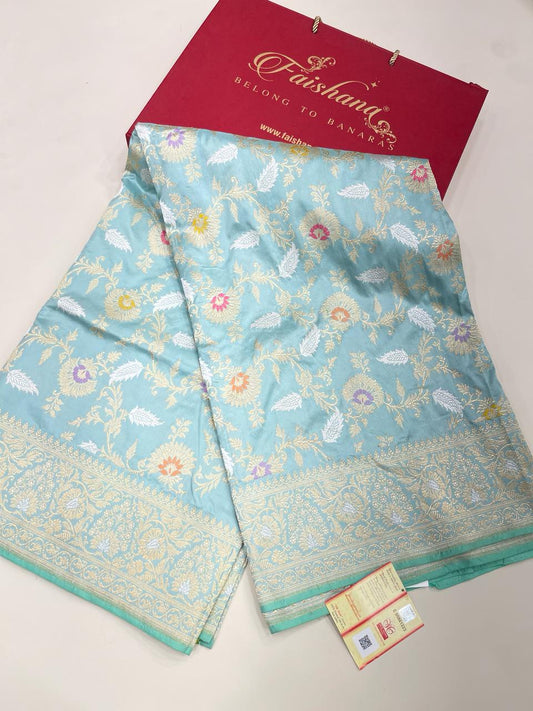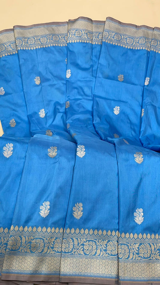 Faishana Pure Handloom Sky Blue Katan Silk Kadhwa Sona Rupa Booti with Kadhwa Anchal Zari border and Sky Blue Blouse