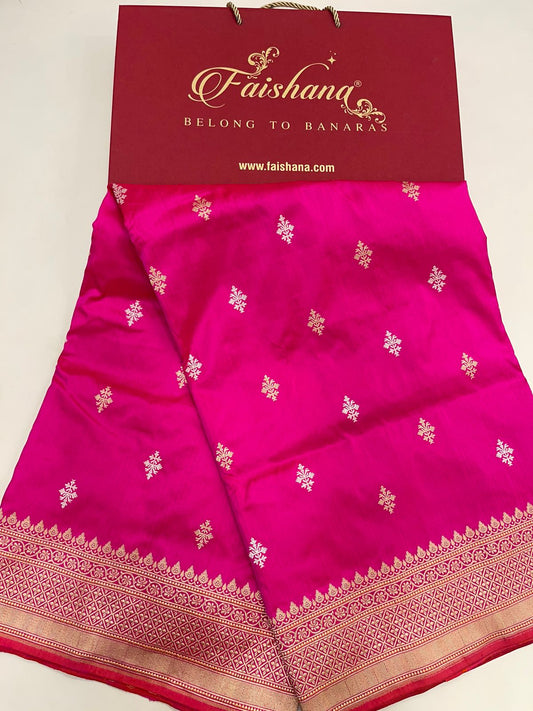Faishana Pure Silk Handloom Pink Katan Silk Sona Rupa Swastik Kadhwa Booti with Kadhwa Border and Pink Stripe Blouse