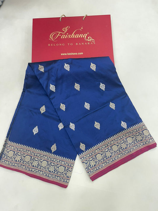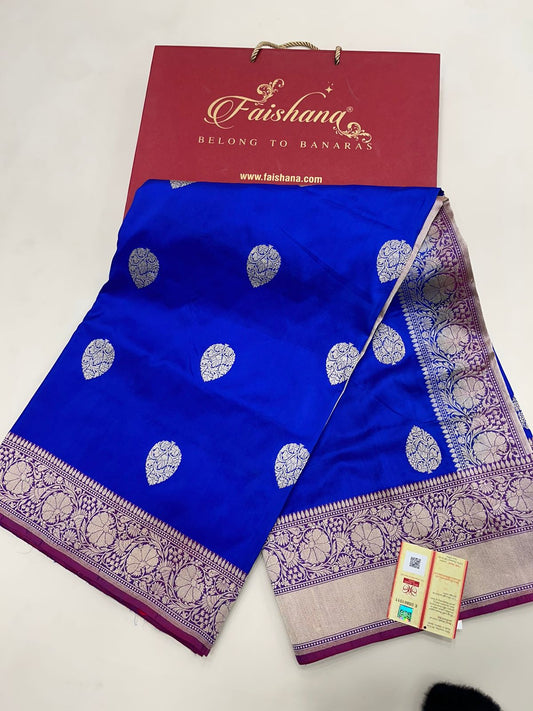 Exquisite Faishana Pure Handloom Royal Blue Katan Silk Kadhwa Boota Saree with Zari Border and Contrast Purple Blouse