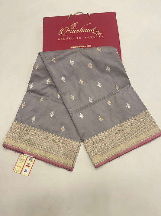 Faishana Pure Handloom Grey Saree with Swastik Gold and Silver Booti Kadhwa Zari Border and Grey Blouse