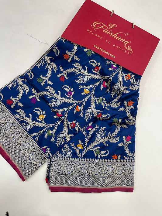 Symphony of Elegance and Tradition: Faishana Pure Handloom Navy Blue Katan Silk Multicolor Minakari Kadhwa Jaal and Zari Border with Navy Stripe Blouse