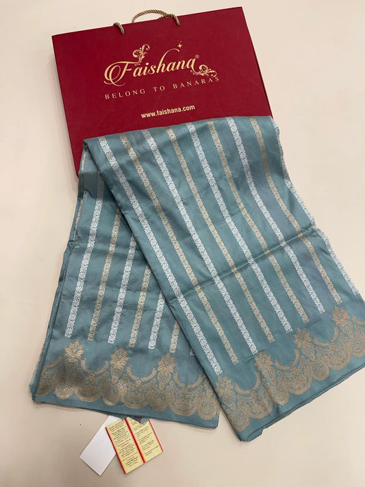 Faishana Pure Silk Handloom Grey Katan Silk Sona Rupa Zari Kadhwa Strip with Kadhwa Zari Border and Grey Blouse