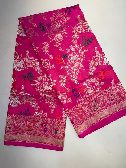 Faishana Pure Handloom Pink Katan Silk Kadhwa Jungla Bandhani Jaal Mina Zari Booti with Pink Golden Zari Booti Blouse