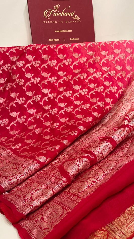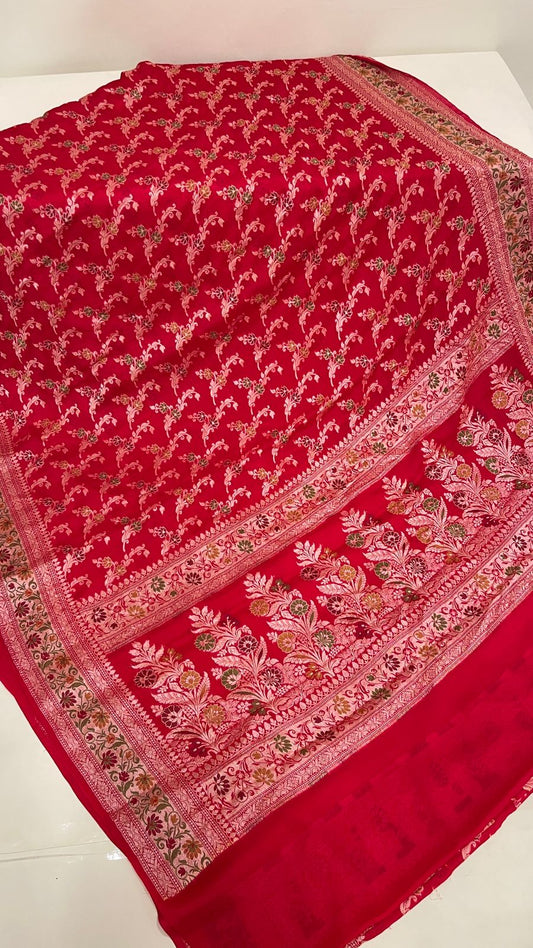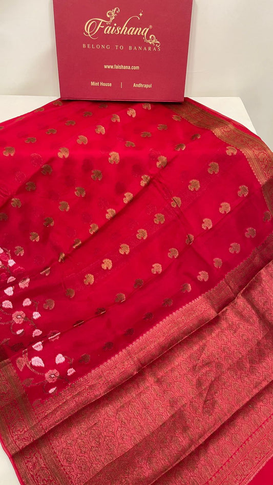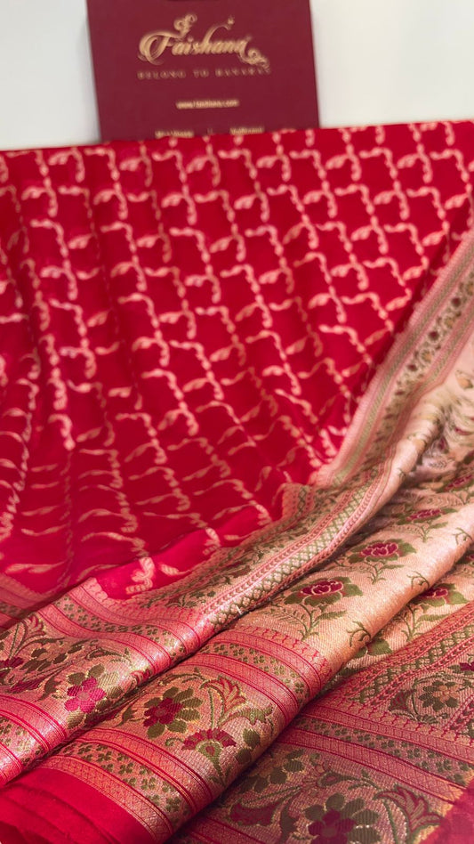 Faishana Pure Handloom Red Chiffon Alfi Mina Zari Jaal Minakari Zari Border and Floral Big Boota Mina Pallu Saree with Red Blouse