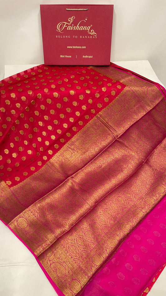 Faishana Pure Handloom Red Chiffon Floral Copper Zari Booti with Contrast Magenta Paisley Zari Border and Magenta Blouse