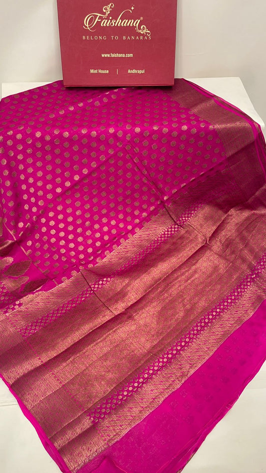 Faishana Pure Handloom Dark Pink Chiffon Golden Zari Floral Booti Jaal with Contrast Magenta Zari Booti Anchal and Zari Border with Magenta Blouse
