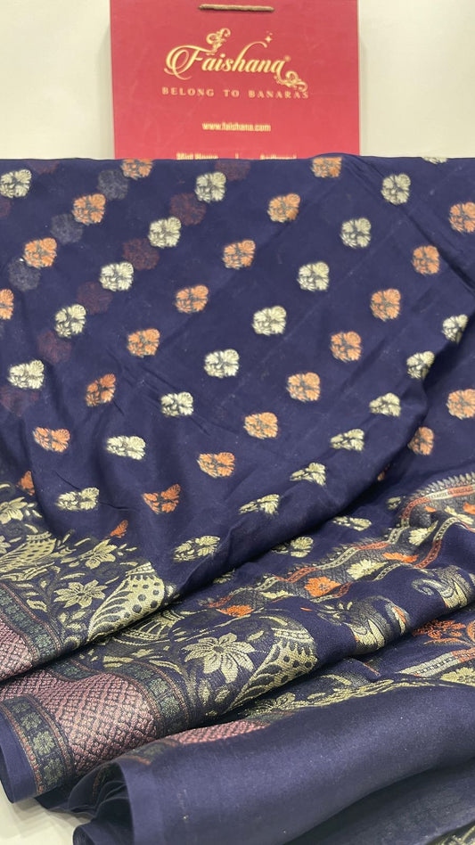 Faishana Pure Handloom Navy Blue Chiffon Resham Floral Mina Booti with Paisley Mina Zari Border and Tilfi Zari Border with Navy Blouse