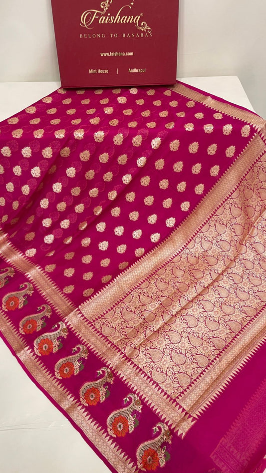 Faishana Pure Handloom Magenta Chiffon Floral Zari Booti with Floral Mina Boota Skirt Zari Border and Paisley Zari Jaal Pallu with Magenta Blouse