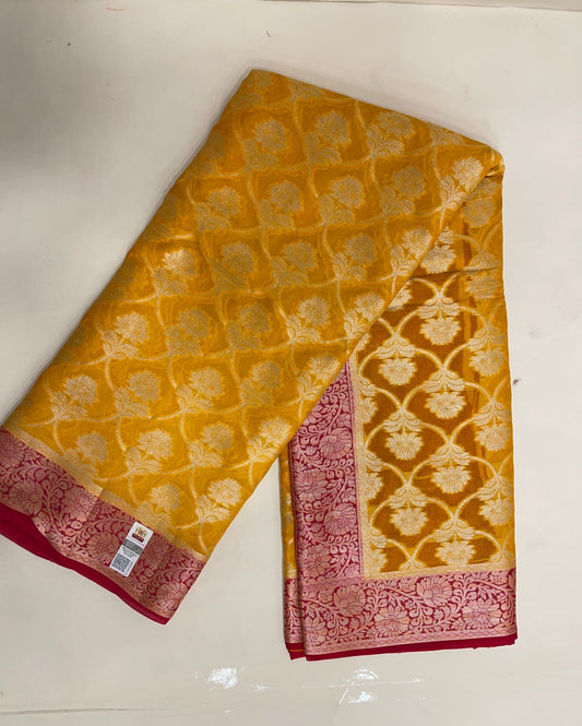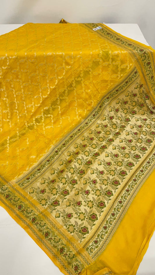 Faishana Pure Handloom Yellow Chiffon Gold Zari Jaal with Floral Mina Jaal Anchal and Tilfi Zari Border with Yellow Blouse
