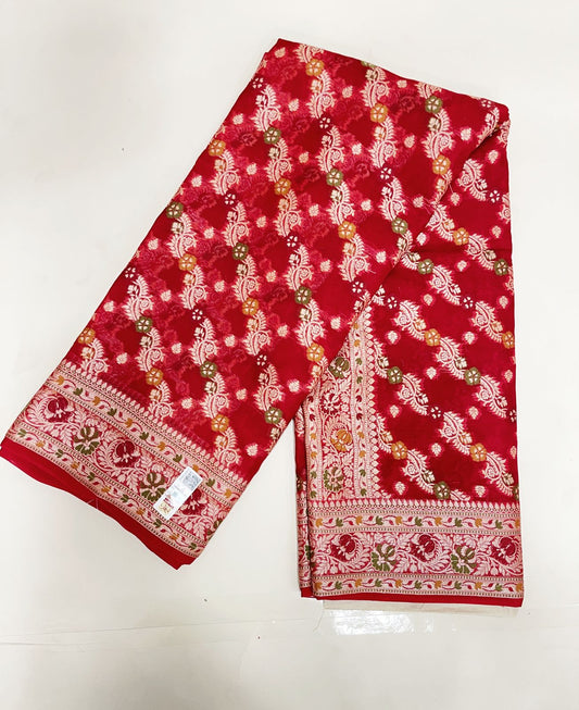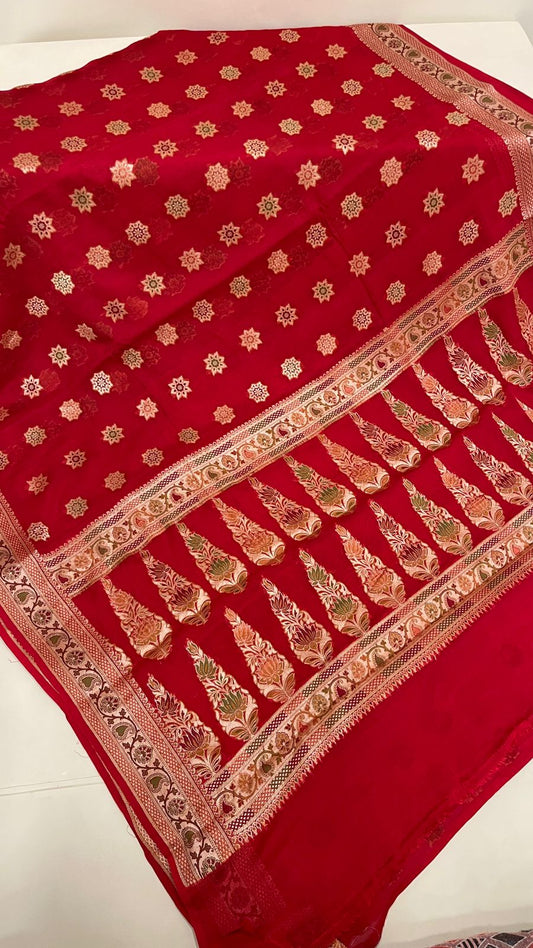 Faishana Pure Handloom Red Chiffon Resham Zari Chunri Mina Booti with Dual Mina Resham Zari Boota Anchal and Floral Zari Border with Red Blouse
