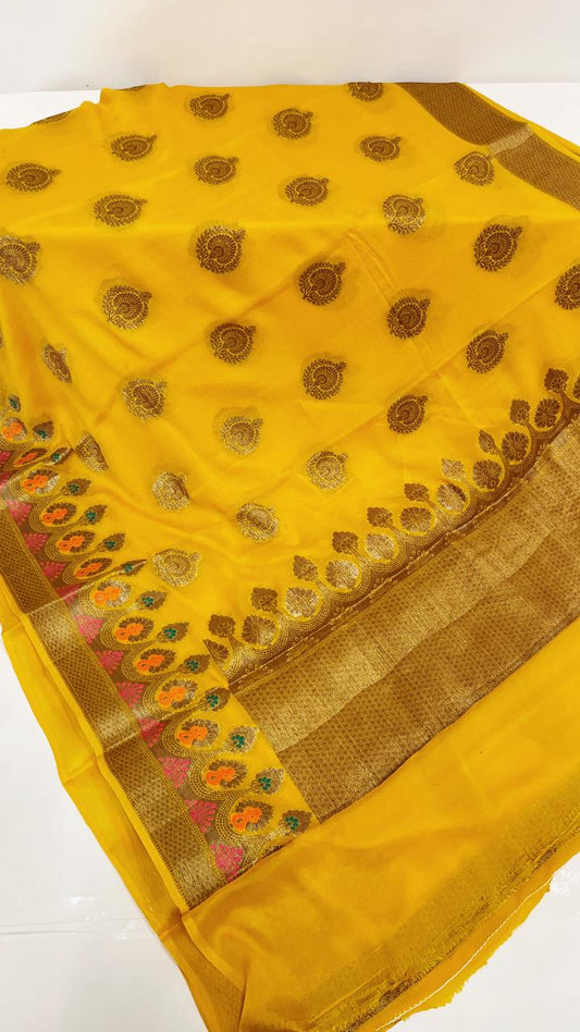 Faishana Pure Handloom Yellow Chiffon Floral Mina Zari Booti with Skirt Mina Copper Zari Border and Yellow Blouse