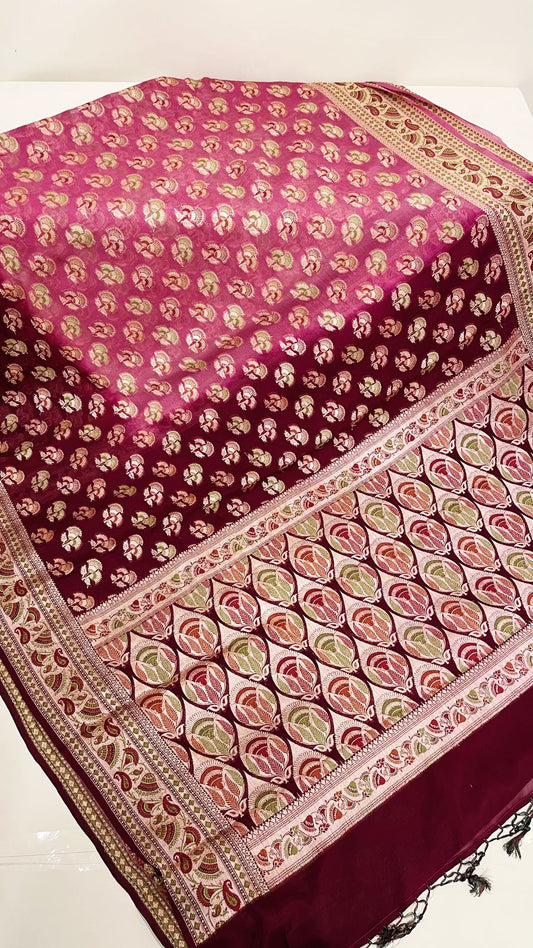 Faishana Pure Handloom Pink Dual Shade Chiffon Floral Resham Mina Zari Booti with Minakari Leaf Pattern Zari Anchal and Minakari Border with Magenta Blouse