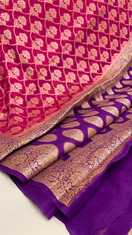Faishana Pure Handloom Magenta Chiffon Golden Zari Floral Booti Jaal with Contrast Purple Zari Booti Anchal and Zari Border with Purple Blouse