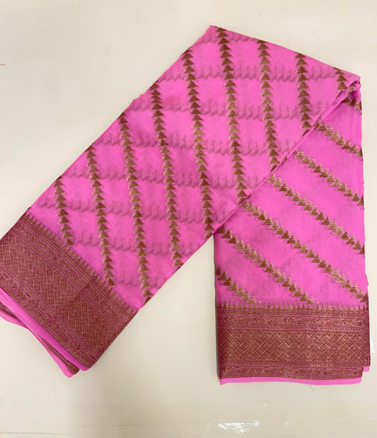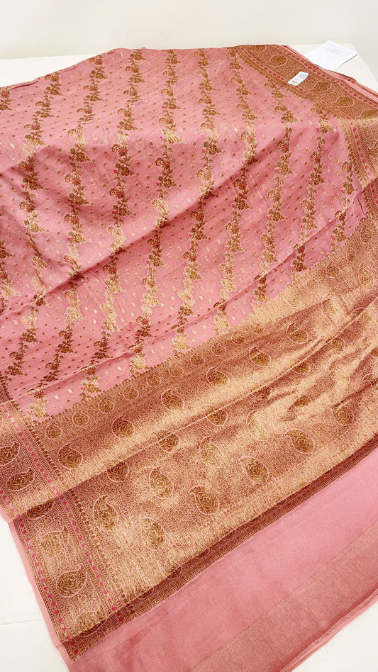 Faishana Pure Handwoven Baby Pink Chiffon Diagonal Stripe Copper Zari with Banarasi Zari Border Pallu and Baby Pink Blouse