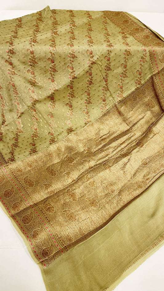 Faishana Pure Handloom Olive Chiffon Floral Copper Zari Mina Stripe Jaal with Paisley Mina Zari Border and Olive Blouse