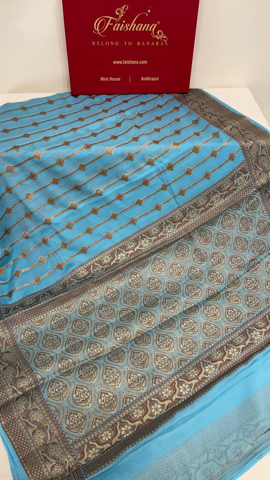 Faishana Pure Handloom Sky Blue Chiffon Copper Stripe Booti Jaal with Resham Mina Zari Border and Sky Blue Blouse