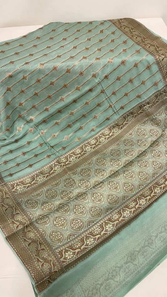 Faishana Pure Handloom Sea Green Chiffon Copper Stripe Booti Jaal with Resham Mina Zari Border and Sea Green Blouse