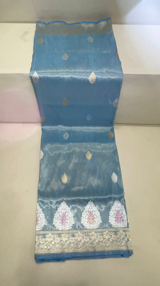 Faishana Pure Silk Handloom Katan Tissue Sky Blue Kadhwa Silver & Golden Floral Zari Booti and Kadhwa Mina Silver Zari Boota Border with Sky Blue Stripe Blouse