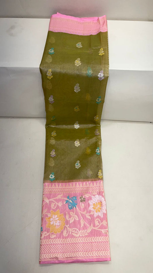 Faishana Pure Handloom Olive Green Kora Tissue Silk Sona Rupa Zari Booti Skirt Tilfi Zari Jaal Mina Contrast Pink Border with Contrast Pink Blouse Banarasi Saree