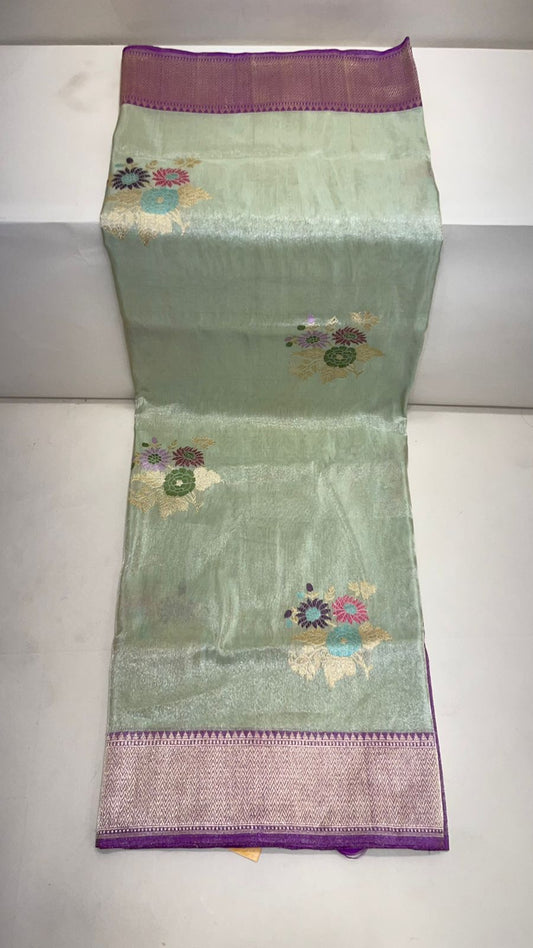 Faishana Pure Handloom Katan Tissue Seagreen Tilfi Kadhwa Mina Zari Booti Boota and Contrast Kadhwa Purple Zari Border Saree with Contrasting Purple Blouse