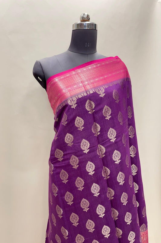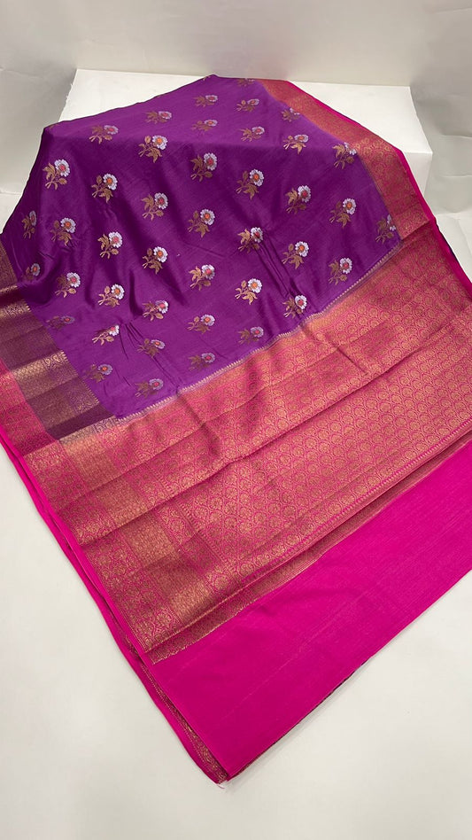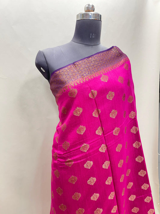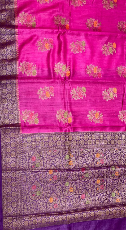 Faishana Pure Handloom Magenta Munga Silk Floral Copper Zari Booti with Contrast Purple Banarasi Floral Pallu Zari Border and Purple Blouse