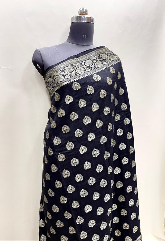 Faishana Presents Pure Handloom Black Munga Silk Floral Minakari Zari Booti Banarasi Floral Jaal Pallu with Black Blouse Piece