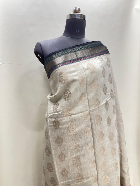 Faishana Pure Silk Handloom Sea Green Muga Silk Zari Mina Floral Booti Contrast Navy Blue Anchal Copper Zari Border Banarasi Saree with Navy Blouse