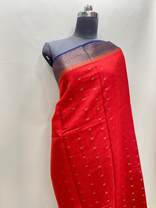Faishana Pure Handloom Red Munga Silk Floral Minkari Copper Zari Booti with Floral Zari Jaal Pallu Zari Border and Red Blouse