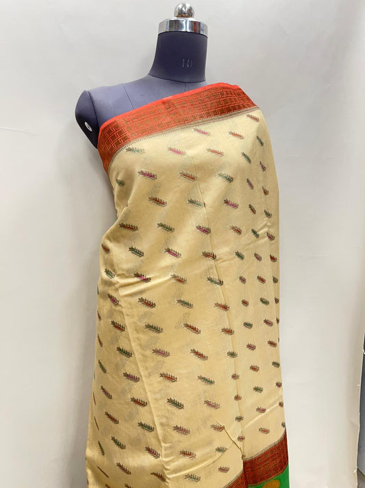 Faishana Pure Handloom Cream Munga Silk Floral Mina Booti with Contrast Orange Floral Minakari Green Pallu Zari Border and Cream Blouse
