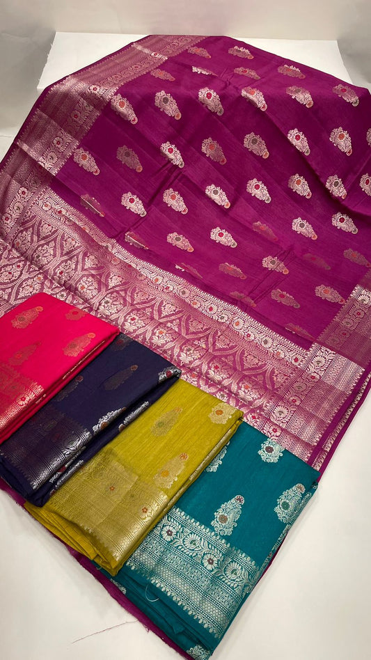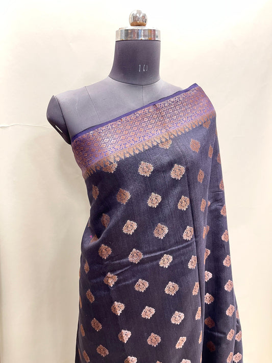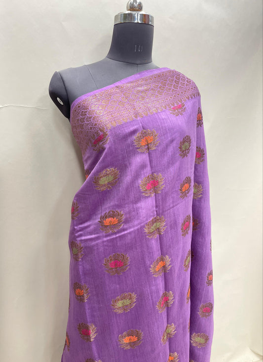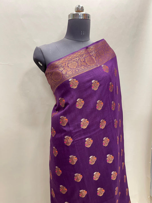 Faishana Pure Handloom Purple Munga Silk Floral Copper Zari Minakari Booti and Floral Zari Jaal Banarasi Pallu Zari Border and Purple Blouse
