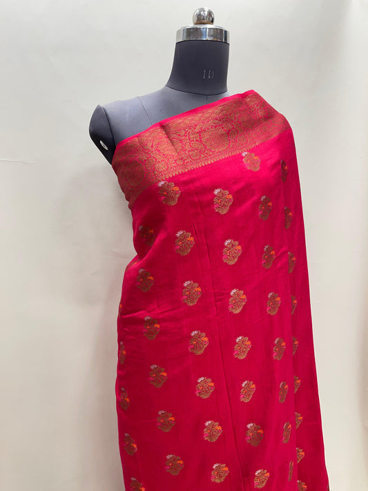 Faishana Pure Handloom Red Munga Silk Floral Gold Zari Mina Booti with Minakari Jaal Pallu Zari Border with Red Blouse