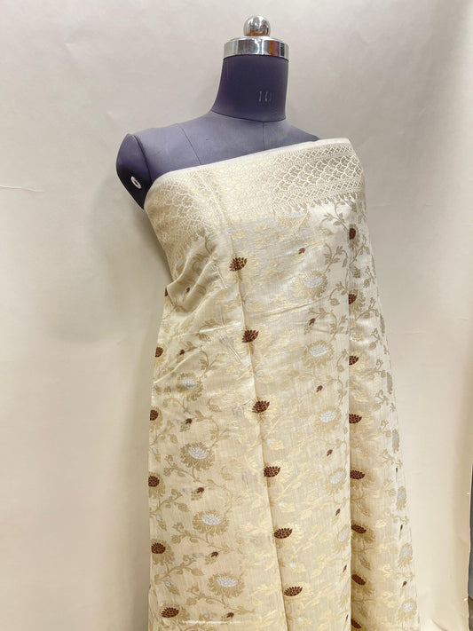 Faishana Pure Handloom White Munga Silk Floral Silver Minkari Zari Jaal with Off white Zig-Zag Pallu Zari Border with Off-white Blouse