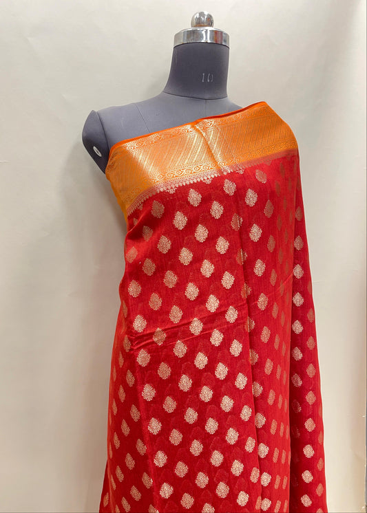 Faishana Pure Handloom Red Munga Silk Floral Gold Zari Booti with Contrast Orange Floral Jaal Pallu Skirt Dual Shade Zari Border with Orange Blouse