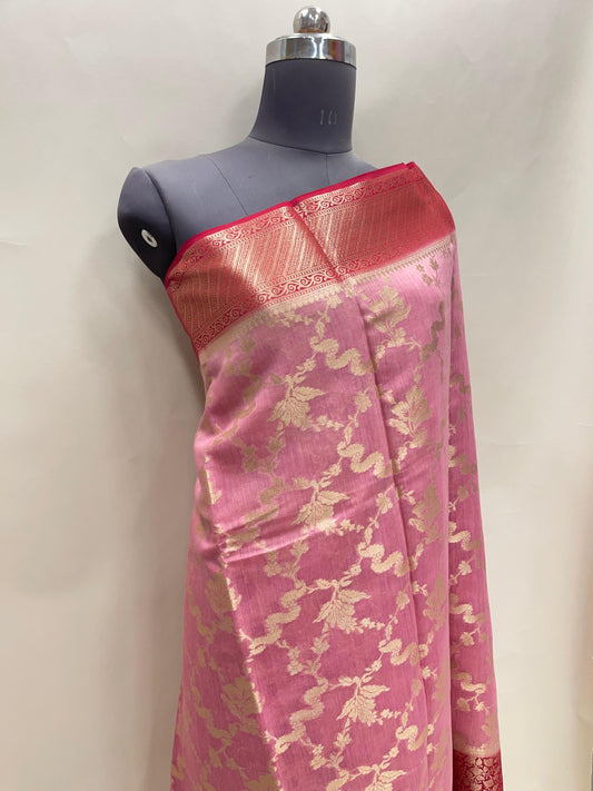 Faishana Pure Handloom Rose Pink Munga Silk Floral Gold Zari Jaal with Contrast Pink Floral Jaal Pallu Skirt Dual Shade Zari Border with Pink Blouse